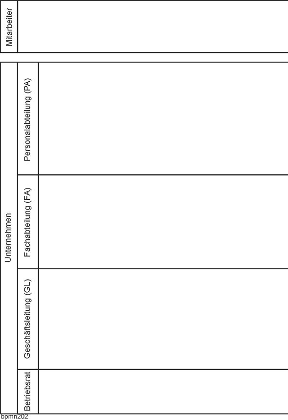 Wie immer bei der Modellierung mit der BPMN empfiehlt es sich, mit der Bestimmung der Akteure (Abteilungen, Personen, Partnerunternehmen, Kunden, usw.) zu beginnen. Hier sind folgende erkennbar: |