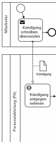 Der Vollständigkeit halber soll der Geschäftsprozess im Becken des Mitarbeiters beginnen. Wir fassen Erstellung und Versand des Kündigungsschreibens in einer Sender-Aufgabe Kündigung schreiben, übersenden zusammen [Anmerkung] . Die Übersendung wird als Nachricht modelliert [Anmerkung] . Entsprechend wird in der Bahn der Personalabteilung (im Becken Unternehmen) eine Prozessstart-Aufgabe für den Vorgang Kündigung entgegennehmen angelegt. Die Nachricht selbst wird an den Nachrichtenpfeil angehängt. Im Mitarbeiter-Becken kann dann dieser kleine Teilprozess gleich durch ein Schlussereignis beendet werden. |