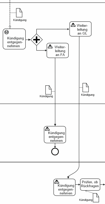Die Weiterleitung des Kündigungsschreibens zur Fachabteilung und Geschäftsleitung (GL) kann durch ein Parallel Gateway und Nutzer-Aufgaben modelliert werden. Außerdem wird die Entgegennahme in beiden Fällen auch durch eine Nutzer-Aufgabe modelliert, zum einen in der Fachabteilung (FA), zum anderen bei der Geschäftsleitung (GL). Zur Verdeutlichung wird an die Sequenzflüsse [Anmerkung] das Datenobjekt Kündigung angehängt. In der FA folgt danach ein Schlussereignis für diese Sequenzfluss, in der GL geht der Prozess weiter. |