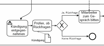 Dies kann wie folgt modelliert werden. In der GL-Bahn wurde ja eine Aufgabe für die Entgegennahme der Kündigung eingefügt. Danach wird nun die Prüfung bzgl. der Rückfragen eingefügt. Bei dieser liegen zwei alternative Fortsetzungen vor, wodurch ein Exclusive Gateway nötig wird. Der eine Zweig führt zu einem Schlussereignis (für diesen Zweig, nicht für den Geschäftsprozess), der andere zu der Aufgabe Mitarbeiter zum Gespräch bitten. Dies wird dem (ehemaligen) Mitarbeiter durch eine Nachricht mitgeteilt, was hier so modelliert ist, dass die Nachricht am Beckenrand von Mitarbeiter andockt. Das ist in dieser Methode zulässig. |