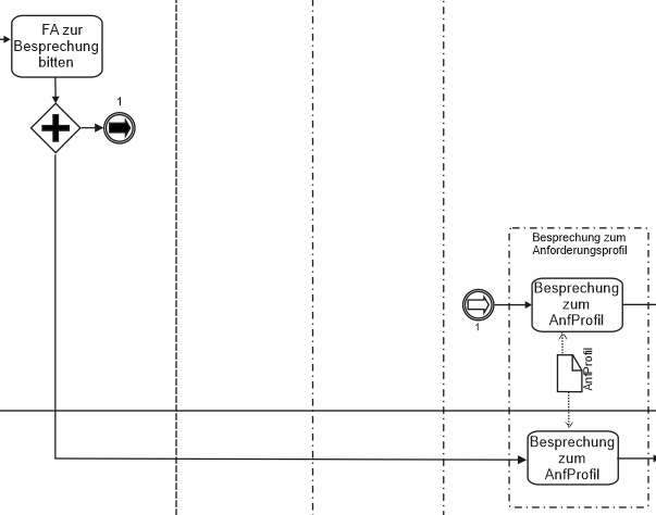 Diese Semantik bilden wird dergestalt in die Syntax des Business Program Diagrams (BPDs) ab, dass vom Parallel Gateway nach der Entgegenahme der Kündigung ein weiterer Sequenzfluss abgeht, der zur Aufgabe FA zur Besprechung bitten führt. Von dieser Aufgabe gehen dann, wieder mittels Parallel Gateway, zwei Sequenzflüsse ab. Der eine in die FA und dort zur Aufgabe Besprechung zum AnfProfil (Anforderungsprofil), der andere, mittels einer Verknüpfung (wegen der Übersichtlichkeit) zur entsprechenden Aufgabe in der PA. Dass beide Abteilungen zusammenwirken, wird wieder durch die Strich-Punkt-Linie ausgedrückt. Beide greifen auf das bisherige Anforderungsprofil zu. |