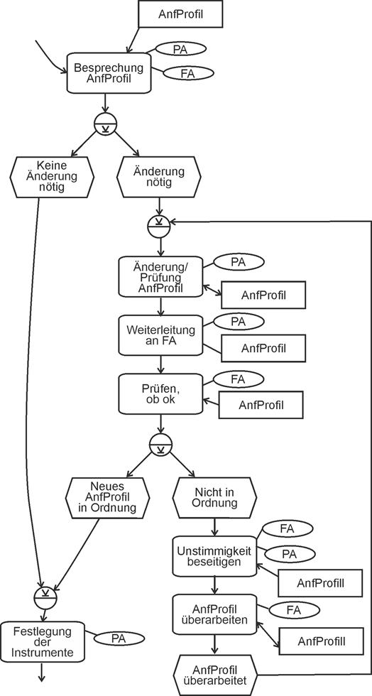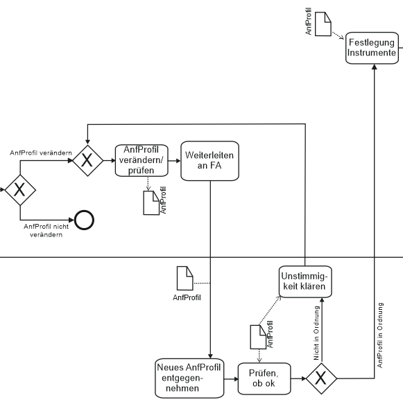 Die Prozessbeschreibung drückt aus, dass dieser Abschnitt mehrfach durchlaufen werden kann. Im Geschäftsprozess und damit im Business Process Diagram entsteht somit eine Rückschleife. Irgendwann wird diese Neugestaltung des Anforderungsprofils zu einem Ergebnis führen, dem die Fachabteilung zustimmen kann, dann gilt AnfProfil in Ordnung und die Schleife findet ein Ende. |