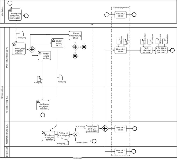 In das Kündigungsgespräch fließt die Kündigung ein und es wird ein Handprotokoll erstellt, was durch Datenobjekte modelliert wird. Ergänzend zur Prozessbeschreibung wird hierbei angenommen, dass dies durch Mitarbeiter der Personalabteilung geschieht. Entsprechend sind die Datenobjekte grafisch in der Bahn der Personalabteilung angeordnet. Dort wird dann auch das Textdokument erstellt und in die Personalakte übernommen. |