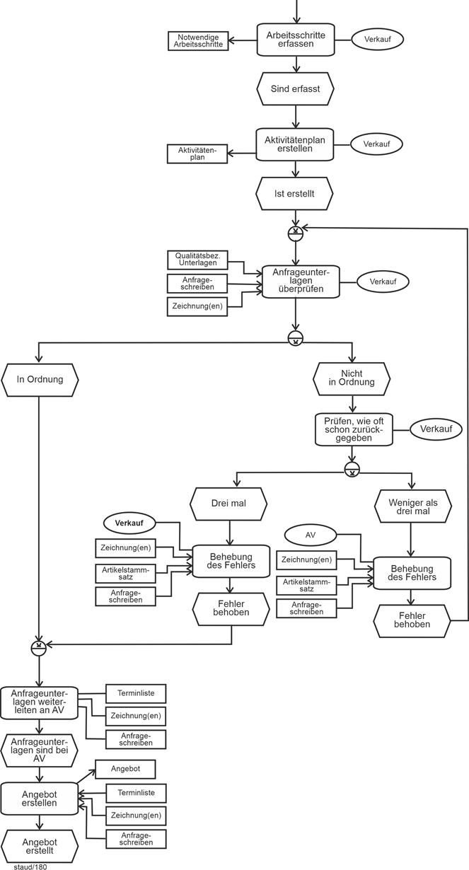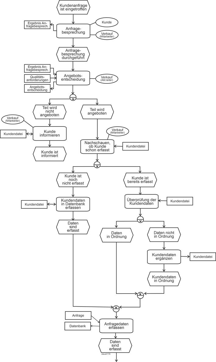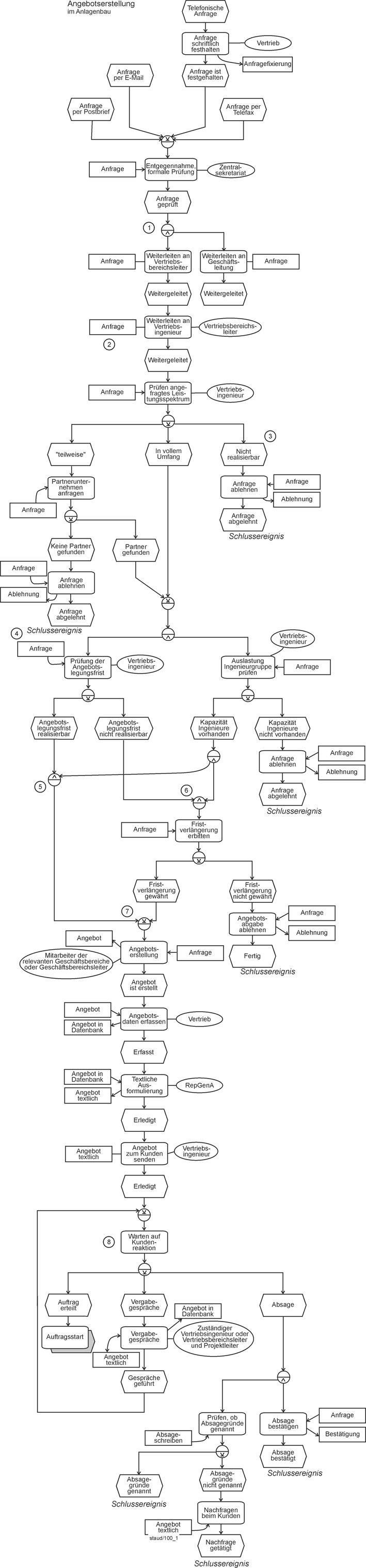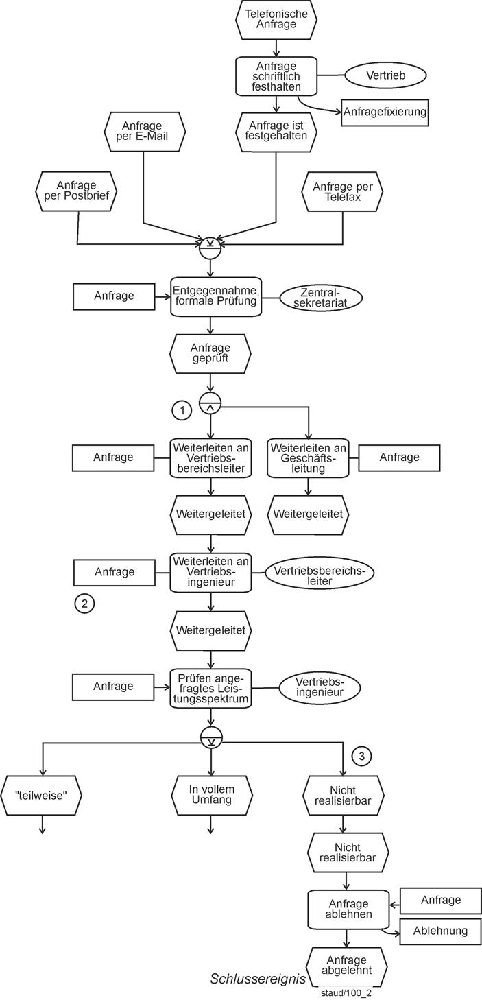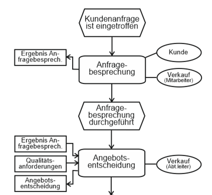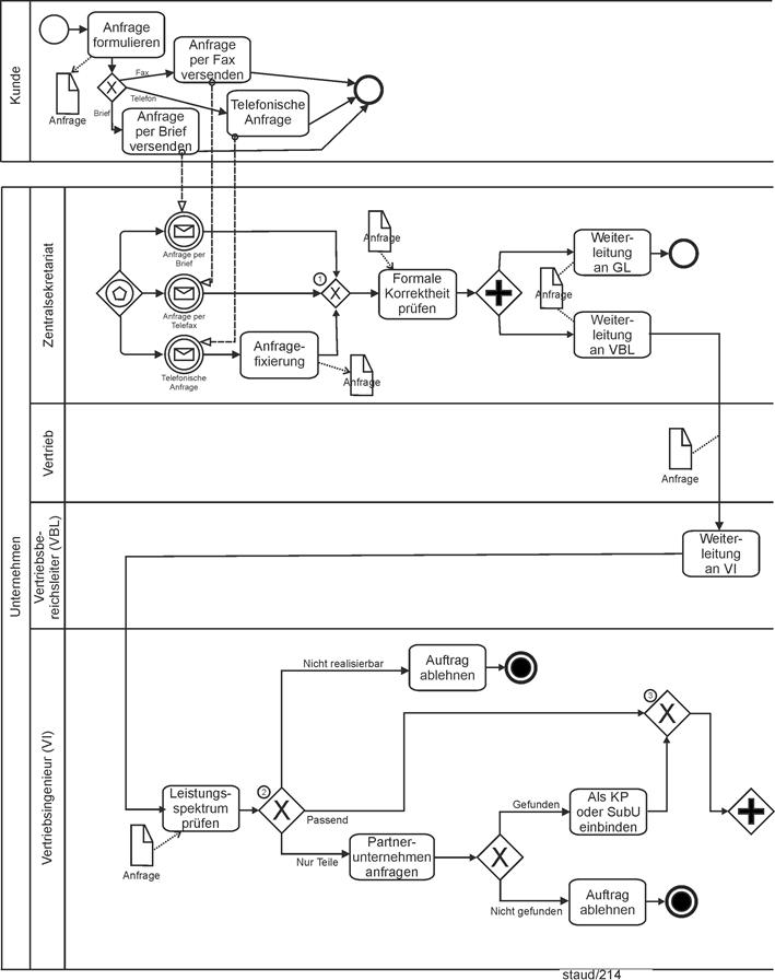 (1) Gestartet wird der Geschäftsprozess aufgrund einer Kundenanfrage. Diese kann per Brief, per Telefax, per E-Mail oder telefonisch eingehen. Falls sie telefonisch eingeht, erstellt der Vertrieb ein schriftliches Dokument, das die Anfrage festhält (Anfragefixierung) Unabhängig von der Art des Eingangs nimmt das Zentralsekretariat die Anfrage entgegen, prüft sie auf formale Korrektheit und leitet sie dann an den zuständigen Vertriebsbereichsleiter (VBL) und die Geschäftsleitung weiter. Der Vertriebsbereichsleiter gibt die Anfrage an einen seiner Vertriebsingenieure weiter, der die Angebotsrealisierbarkeit prüft. |