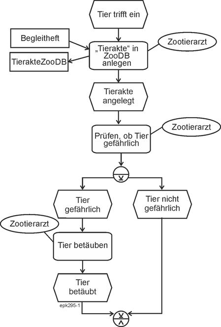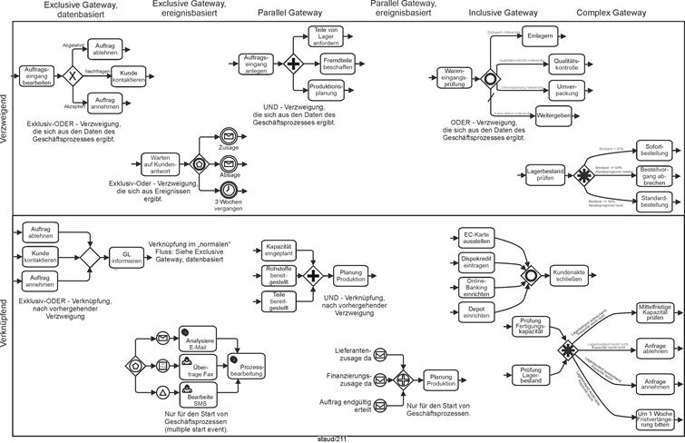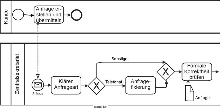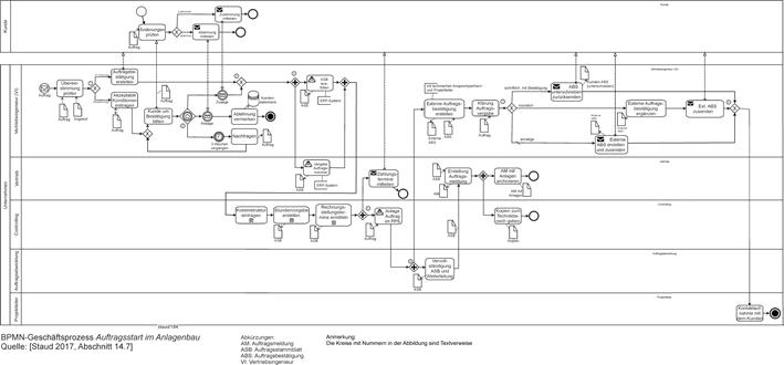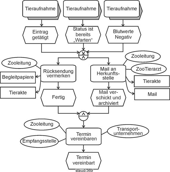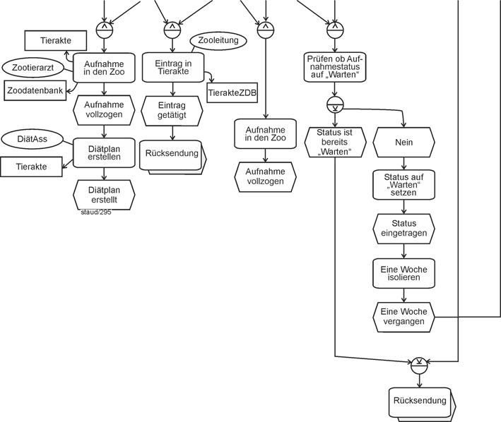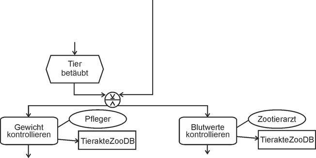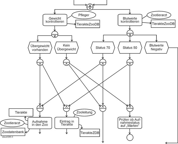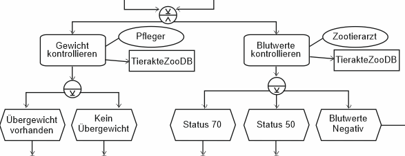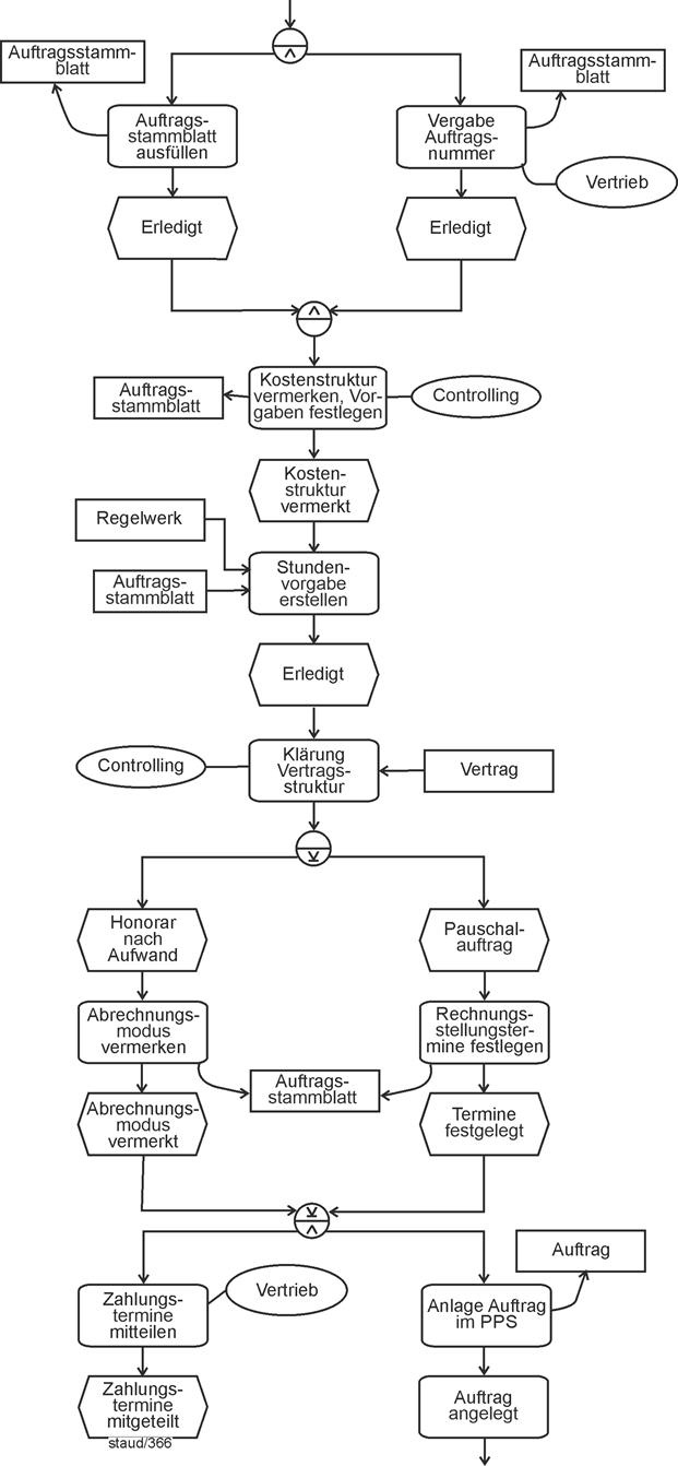 Nach den dann folgenden Ereignissen können die beiden Kontrollflusszweige wieder mit einem UND-Operator zusammengeführt werden. Anschließend folgt im obigen Text die "Vermerkung" der Kostenstruktur. Dafür wird eine Funktion Kostenstruktur vermerken, Vorgaben festlegen mit der Organisationseinheit Controlling und dem Informationsobjekt Auftragsstammblatt eingefügt. Hier ist im Text wiederum die konkrete Ausführung der Funktion angedeutet. Der Prozessanteil besteht hier nur aus einer Funktion. Dies muss man erkennen, wenn man eine Prozessbeschreibung bekommt: Was ist Prozess, was ist Funktionsausführung. Vgl. hierzu auch [Staud 2014, Abschnitt 12.2] und ein deutlicheres Beispiel gleich hier unten. |