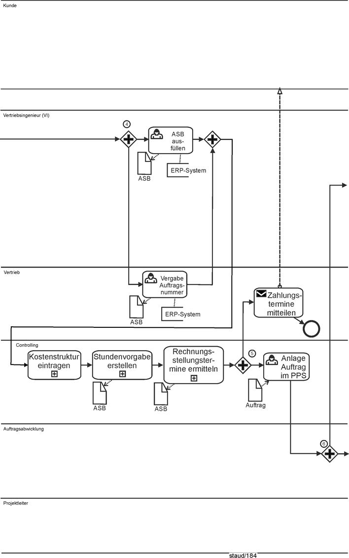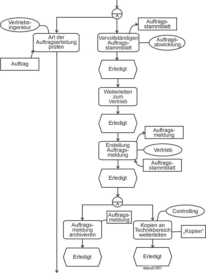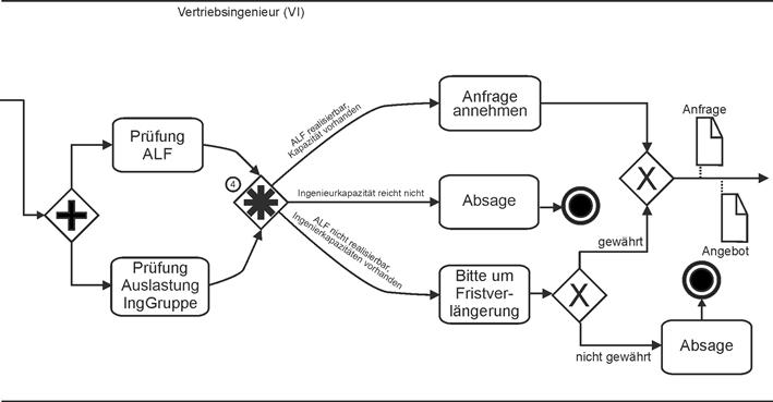 Obiger Text führt nun zurück zur vorigen Abbildung. Dort wurde diese Erstellung der externen Meldung "parallel" zur Funktion Vervollständigen Auftragsstammblatt eingefügt werden. Dies wurde mit einem UND-Operator realisiert. Parallel wurde in Bezug auf obige Punkte die Funktion Art der Auftragserteilung prüfen eingefügt. Sie wird vom Vertriebsingenieur realisiert. |