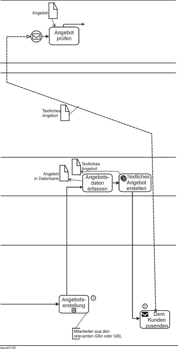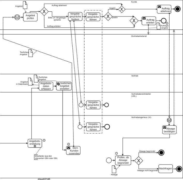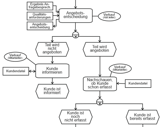 - Nach der Püfung folgt ein XODER-Operator mit zwei Ereignissen, Absagegründe genannt und Absagegründe nicht genannt. Bei ersterem endet der Kontrollflusszweig, bei zweiterem folgt die Funktion Nachfragen beim Kunden (mit gelesenem Informationsobjekt Angebot textlich und dann einem Schlussereignis für den Kontrolllfusszweig, Nachfrage getätigt.