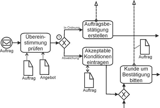 Die Beschreibung des Geschäftsprozesses beginnt mit dem Eingang des Auftrags, entweder ohne oder mit der vorangehenden Anebotserstellung. Dies wird durch ein Startereignis Auftrag ist eingegangen modelliert. Die Prozessbeschreibung führt dann aus, dass sich der Auftrag auf ein vorher erstelltes Angebot bezieht. Die in der Prozessbeschreibung angeführte Prüfung auf Übereinstimmung mit dem Angebot wird durch die Funktion Prüfung auf Konditionen modelliert. Als Organisationseinheit wird der Vertriebsingenieur angefügt, als Informationsobjekte das zuvor erstellte Angebot und der vom Kunden zugeschickte Auftrag. |