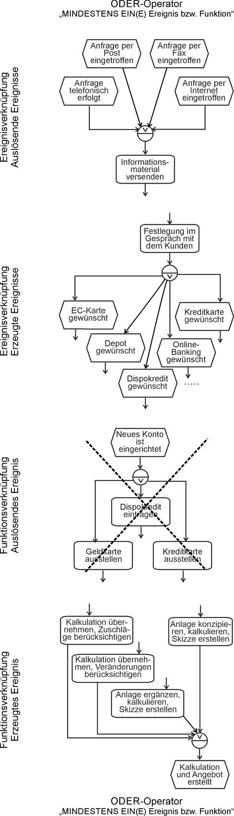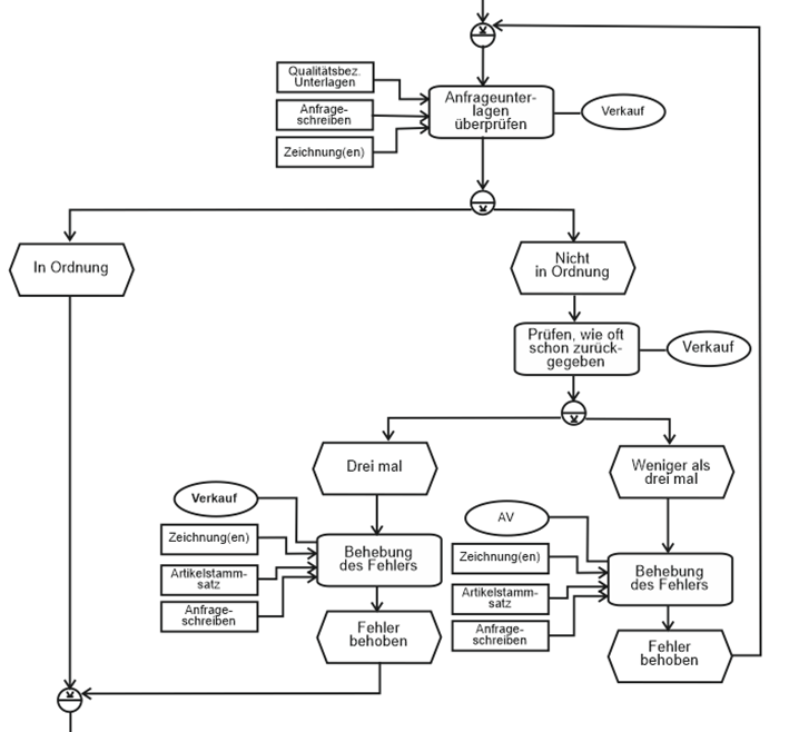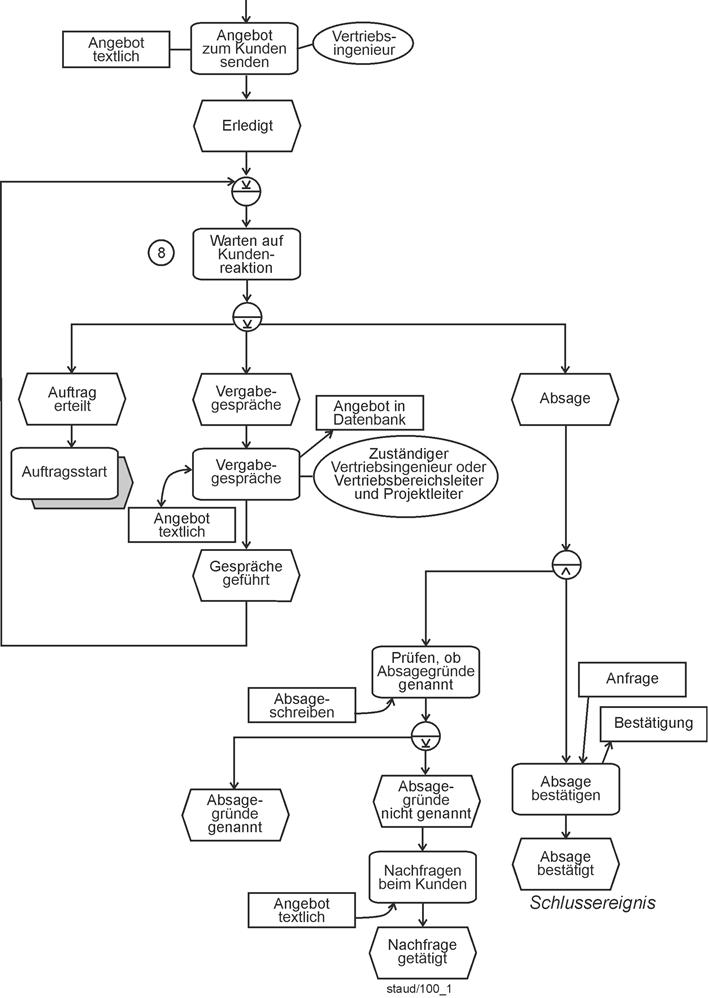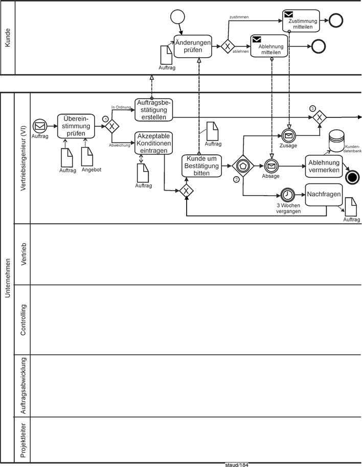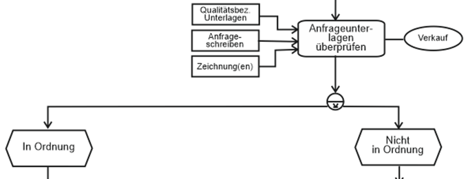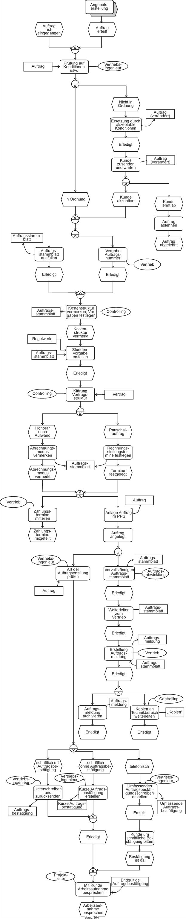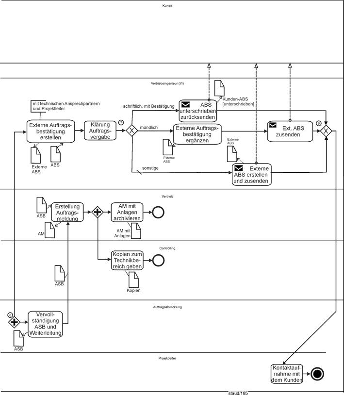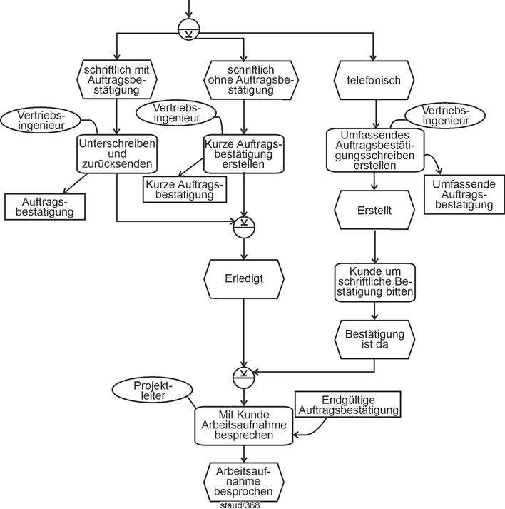 - Funktion Umfassendes Auftragsbestätigungsschreiben erstellen mit der Organisationseinheit Vertriebsingenieur und dem Informationsobjekt Umfassende Auftragsbestätigung. Hier folgt ein Ergebnisereignis und eine nicht näher spezifizierte Funktion Kunde um schriftliche Bestätigung bitten mit einem Ereignis Bestätigung ist da. Was geschieht, wenn die Bestätigung nicht eintrifft, ist nicht ausgeführt. Ist wohl unwahrscheinlich.