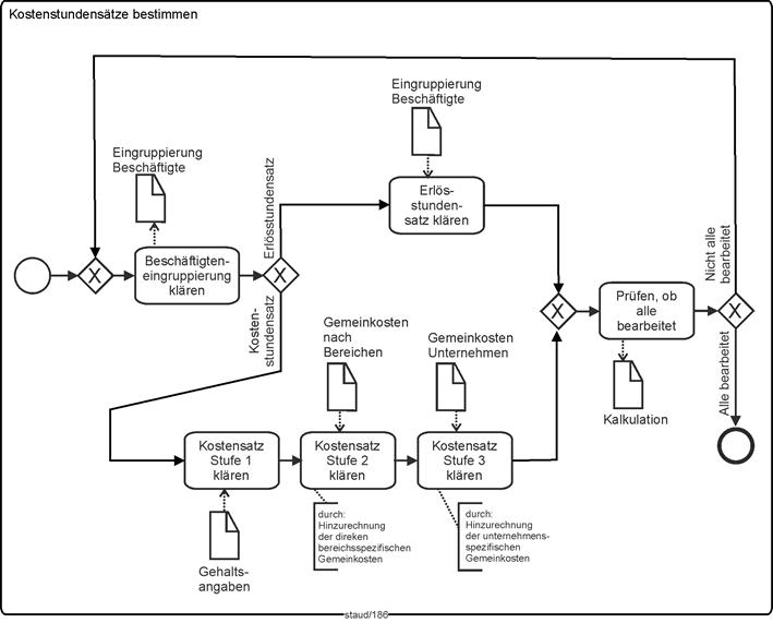Dabei werden drei Stufen unterschieden. Der erste Kostensatz ergibt sich aus dem jeweiligen Gehalt des Mitarbeiters. Die Hinzurechnung der direkten bereichsspezifischen Gemeinkosten ergibt den zweiten Kostensatz. Die weitere Addition des unternehmensspezifischen Gemeinkostensatzes ergibt den endgültigen dritten Kostensatz. |
