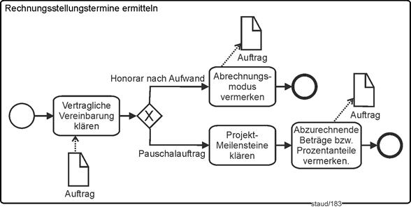 Geht es um Honorar nach Aufwand kann aus der Prozessbeschreibung eine Funktion Abrechnungsmodus vermerken mit Ergebnisereignis abgeleitet werden. Geht es um einen Pauschalauftrag folgt eine Funktion Rechnungsstellungstermine festlegen, ebenfalls mit Ergebnisereignis. Der übrige Text beschreibt diese Funktionen und wird deshalb ignoriert. Das Informationsobjekt bei diesen beiden Funktionen ist aus dem Text nicht ersichtlich, es wurde ergänzt. Im Anschluss daran kann der Kontrollfluss wieder mit einem XODER-Operator zusammengeführt werden. |