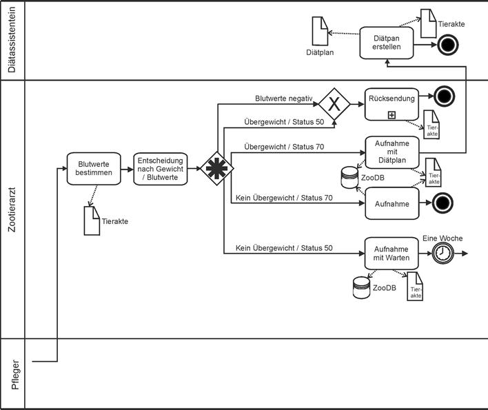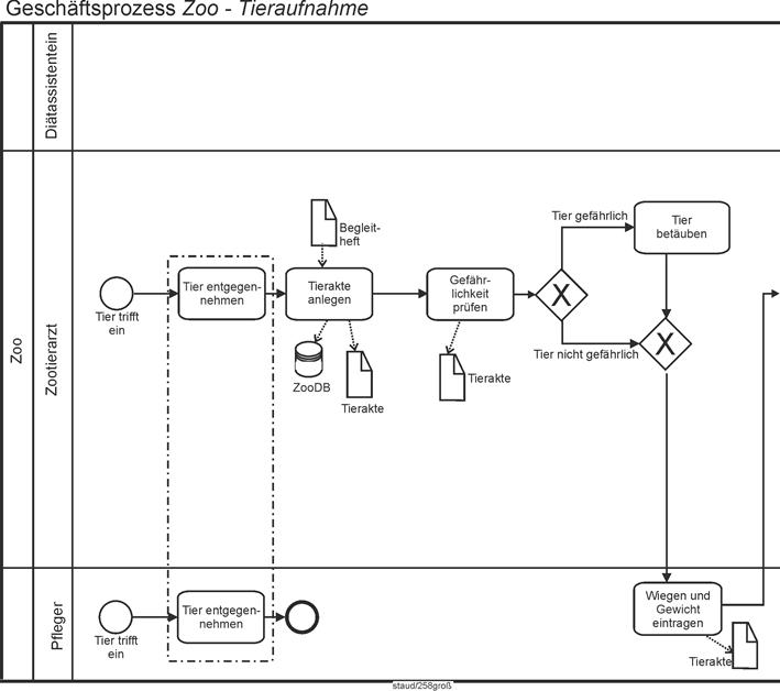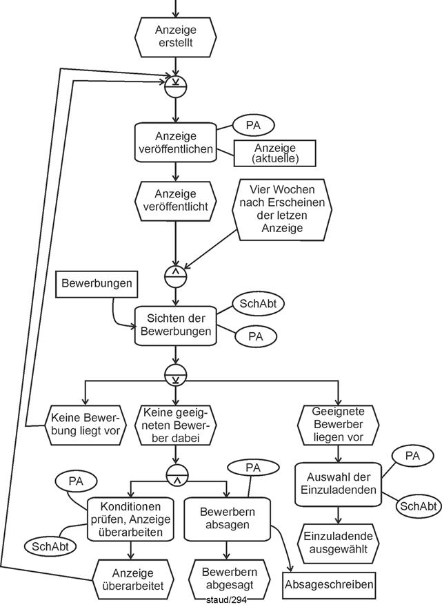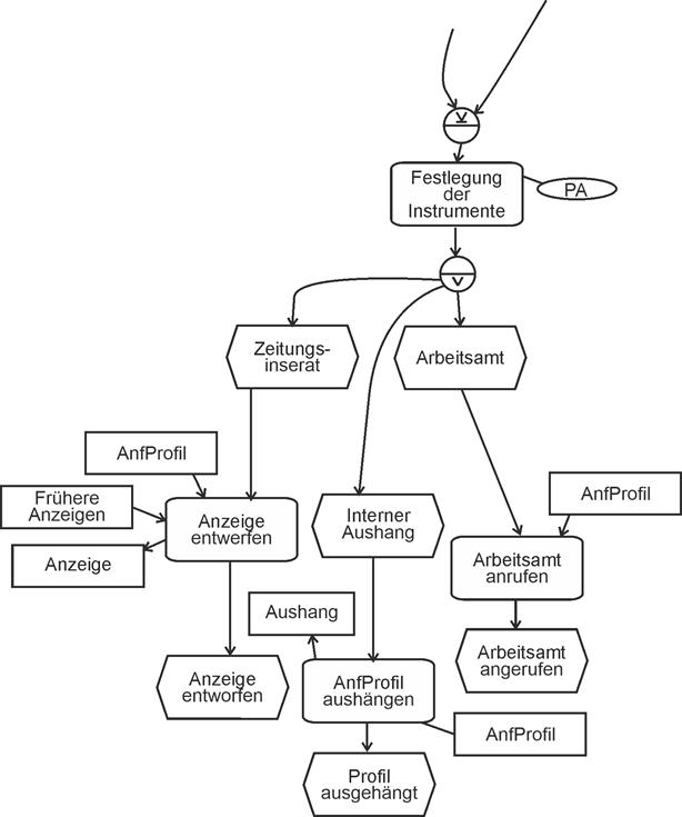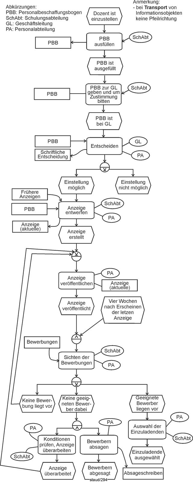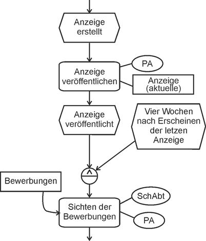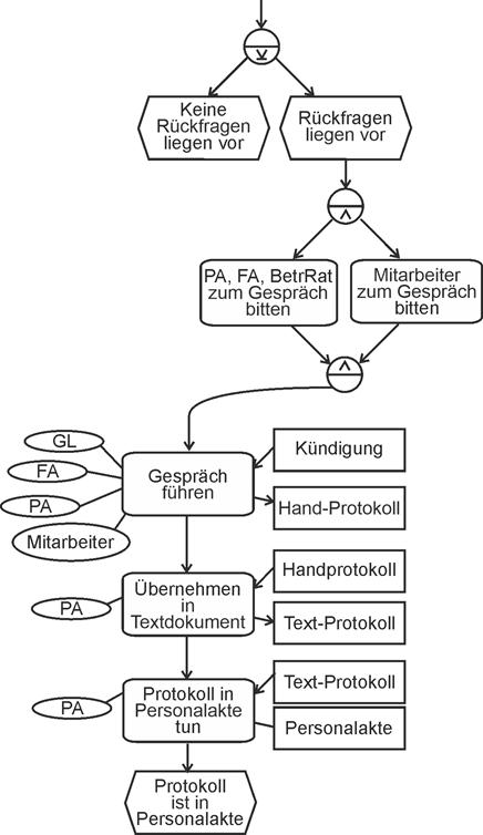 Der restliche hierzu gehörige Prozessabschnitt (Textdokument erstellen, in Personalakte übernehmen) wird durch die Personalabteilung realisiert. Die Datenobjekte drücken jeweils den Informationsfluss aus. Bei der Erstellung des Textdokuments wird das Handprotokoll gelesen und das Textprotokoll erstellt, die Übernahme in die Personalakte wird so erfasst, dass das Textprotokoll nur transportiert wird (keine Pfeilspitze