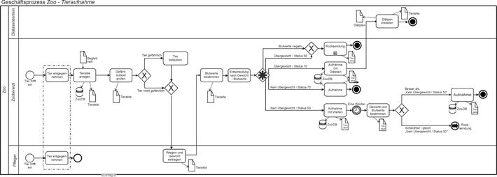 Danach findet der Geschäftsprozess sein Ende, in der Grafik durch ein Beenden-Ereignis (Terminate) ausgedrückt. Die folgende Abbildung zeigt das gesamte Business Process Diagram in zwei Teile aufgeteilt. Hier mit Hilfe von Verknüpfungs-Zwischenereignissen. Eine Wiedergabe der gesamten Abbildung ist an dieser Stelle aus technischen Gründen nicht möglich. Diese findet sich aber dort: |
