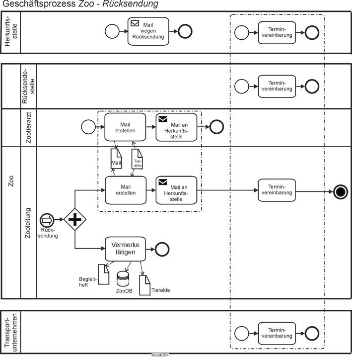 Der Nachrichtenpfeil zum Becken des Mitarbeiters wurde hier aus Platzgründen weggelassen. Vgl. dazu das Gesamtmodell in Abbildung 2.1-8. |