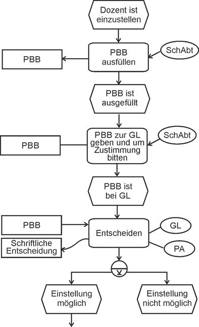 (4) Obiger Abschnitt, der Durchgang des Anforderungsprofils durch die FA, kann auch mehrmals nötig werden. Er wird solange wiederholt, bis die abschließende Prüfung durch die PA (Leitung) positiv ausfällt. |