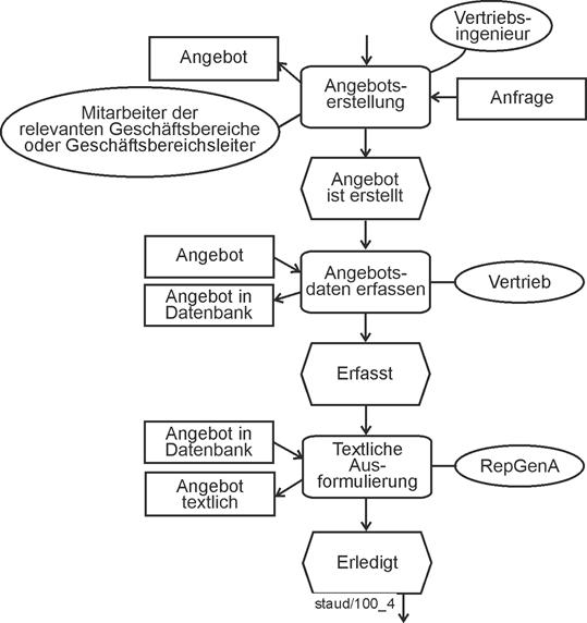 In der nachfolgenden Funktion Angebotsdaten erfassen wird dann das Informationsobjekt Angebot gelesen und ein weiteres geschrieben, ein Eintrag in eine Datenbank mit allen Angeboten, die im Unternehmen erstellt werden (Angebot in Datenbank). Aus diesem Datenbankeintrag heraus entsteht dann mit Hilfe des Reportgenerators Angebote (RepGenA) die textliche Fassung des Angebots (Angebot textlich). Diese Funktion wird also von einem Programm durchgeführt, aber natürlich von einem Menschen gestartet. Hier soll angenommen werden, dass die vorige Funktion nach Abschluss ihrer Aktivitäten diesen Startvorgang durchführt. |