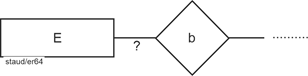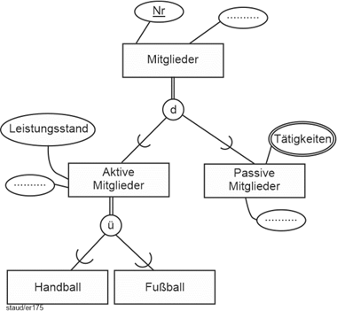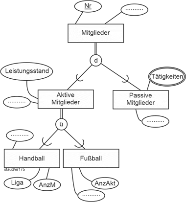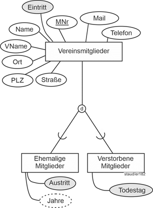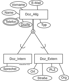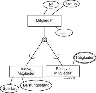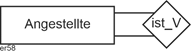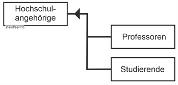 Für die grafische Darstellung einer Generalisierung / Spezialisierung gilt: Der generalisierte Entitätstyp wird immer links von den spezialisierten Entitätstypen angeordnet. Von der Generalisierung führt eine blaue Linie zu jeder der Spezialisierungen. Ein blaues Dreieck (im Original, hier wurde die Farbgebung beseitigt), sozusagen links von allen Spezialisierungen, signalisiert die Generalisierung / Spezialisierung. Vgl. hierzu die Beispiele in den Abbildungen unten. |