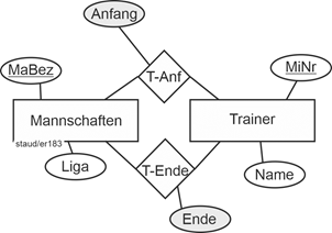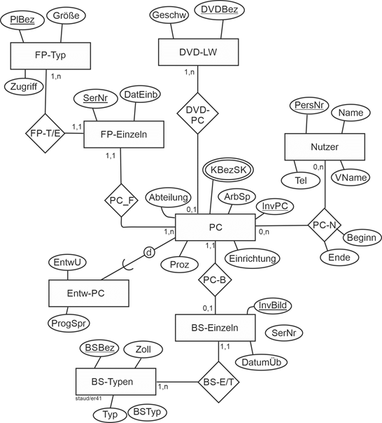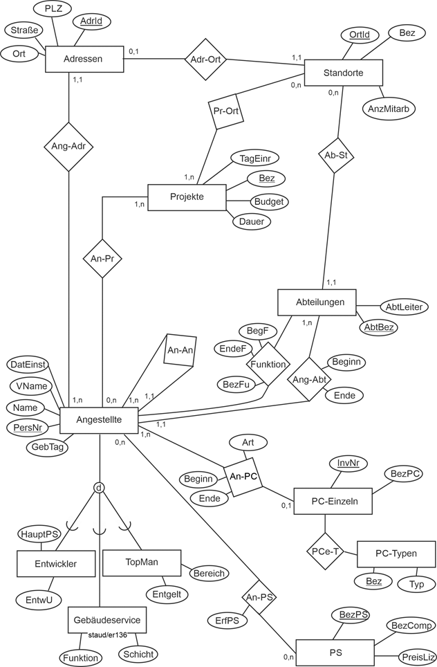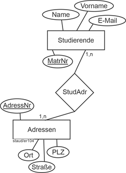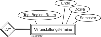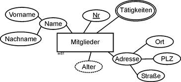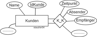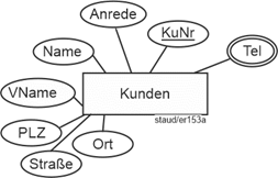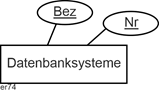 Jede Modellierungstechnik für Datenbanken bildet Aspekte des zu modellierenden Anwendungsbereichs in ein Modell ab. In ein semantisches, logisches, objektorientiertes, usw. Die Technik der Entity Relationship - Modelle (ER-Modelle) gehört zu denen, die im Anwendungsbereich Objekte und Beziehungen zwischen diesen mit Hilfe von Attributen identifizieren und beschreiben. |