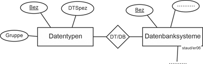 Abgrenzungen sollte man v.a. in zweierlei Hinsicht machen. Erstens zur objektorientierten Datenmodellierung. Die Modellierungstechnik ist hier eine ähnliche, wenn auch mit anderer Begrifflichkeit, z.B. Klasse statt Typ. V.a. aber kommen bei der objektorientierten Modellierung, sei es für Datenbanken oder Systeme, die sog. Methoden mit dazu. Damit werden die statischen Aspekte des Anwendungsbereichs, die durch Datenbanken erfasst werden, durch dynamische ergänzt. Für eine umfassende Einführung in die objektorientierte Modellierung mit der UML 2.5 vgl. [Staud 2019]. |