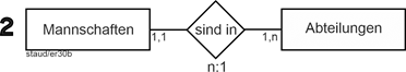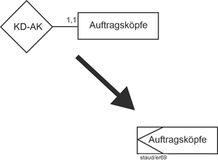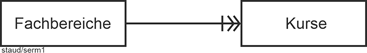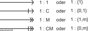 Kardinalitäten werden, wie oben schon gesehen, durch die Gestaltung der Pfeilspitzen verdeutlicht. Unterschieden wird die rechte und die linke Seite der Kardinalität. Da es sich immer um Beziehungen vom Start-Entitätstyp zu einem Ziel-Entitätstyp handelt, genügt die Festlegung der rechten Seite. Folgende Symbole werden verwendet: |