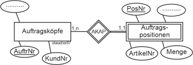 Neben den Beziehungen mit optionalem Charakter gibt es in diesen Datenmodellen durchaus auch welche, die vorliegen müssen. Wie der Abbildung entnommen werden kann, kann es zu einer Bestellung Gesamtkonditionen geben, während zu einer Bestellgesamtkondition einzelne Bestellpositionskonditionen vorhanden sein müssen. Außerdem muss es zu einer Bestellung Bestellpositionen geben (ist ja auch naheliegend) und zu letzteren Bestellpositions-Einteilungen. |