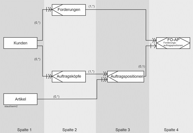Die Positionierung in der Abbildung gibt ebenfalls Hinweise auf die Art der Beziehung: "Hierarchische und aggregierende Beziehungen münden von links ein, referentielle Beziehungen von oben oder von unten" [SAP Hilfe 1]. |