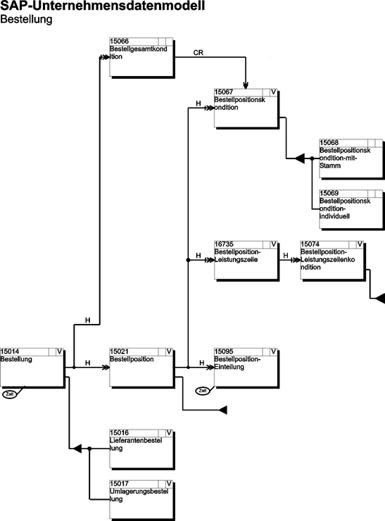 Abbildung 13.4-4: Datenmodell Bestellung Quelle für alle Datenmodelle dieses Abschnitts: SAP R/3. Vom Verfasser 2005 erfasst und grafisch bearbeitet. |