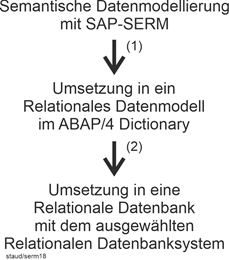 Auch nach den Erfahrungen des Verfassers ist ein SERM oder SAP SERM leichter in eine logische (hier: relationale) Datenbank umsetzbar, als ein ERM. Insbesondere die Möglichkeit der Anordnung nach Abhängigkeiten (von links nach rechts) und die damit erfolgte Klärung der Fremdschlüsselarchitektur ist sehr hilfreich. Sie erlaubt eine rasche Übernahme und die Vermeidung von Fehlern. |