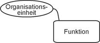 Die grafische Darstellung von Organisationseinheiten in Ereignisgesteuerten Prozessketten erfolgte durch eine in der Mitte beschriftete Ellipse. Organisationseinheiten sind immer durch eine richtungslose Verbindungslinie mit der Funktion verbunden, die realisiert wird. |
