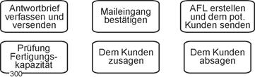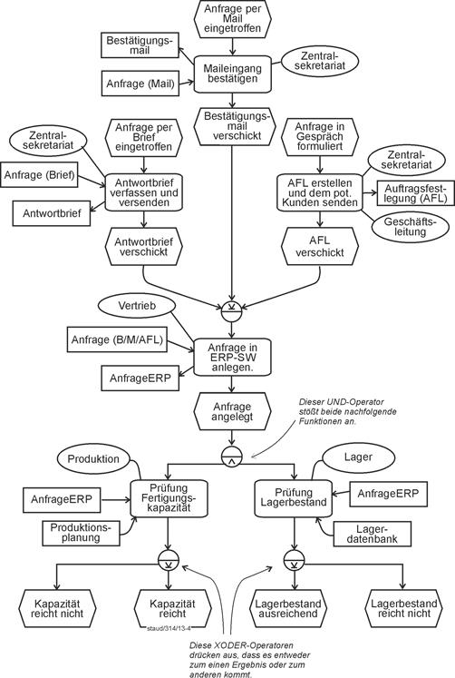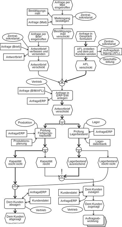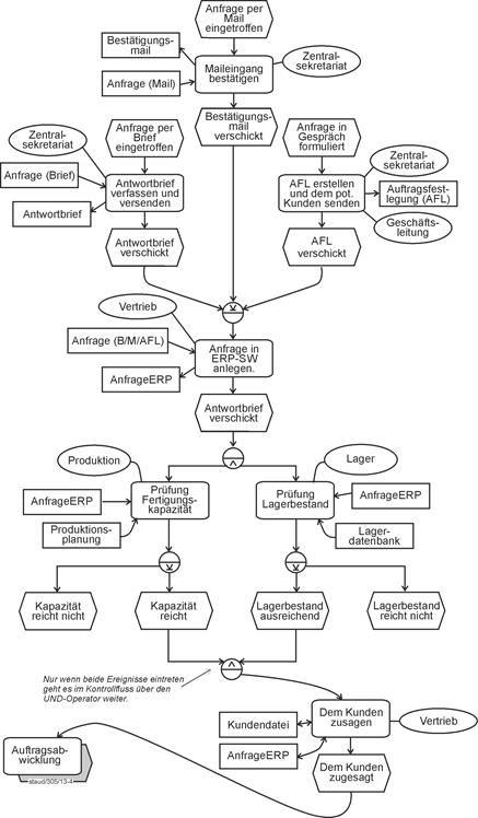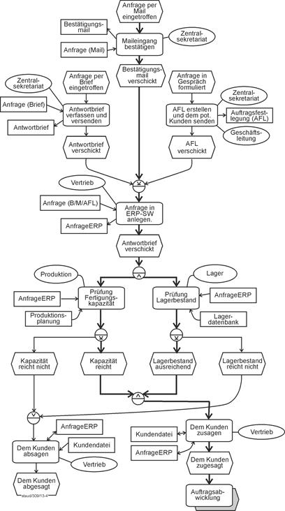 Der folgende Geschäftsprozessausschnitt liegt hier zugrunde: Es geht - bei einem Industrieunternehmen mit Einzelfertigung - um die Prüfung, ob die Anfrage eines Kunden nach einem bestimmten Produkt erfüllt werden kann oder nicht. |