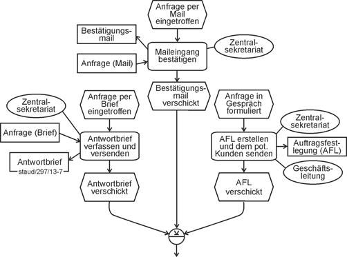 Die Anfrage kann per Mail, per Brief eintreffen oder in einem Gespräch formuliert worden sein. Bei Briefanfragen wird ein Antwortbrief verfasst und versendet. Bei Mailanfragen wird der Maileingang bestätigt, bei im Gespräch formulierten Anfragen eine Auftragsfestlegung (AFL) formuliert und dem potentiellen Kunden geschickt. Alle diese Aktivitäten übernimmt das Zentralsekretariat. |