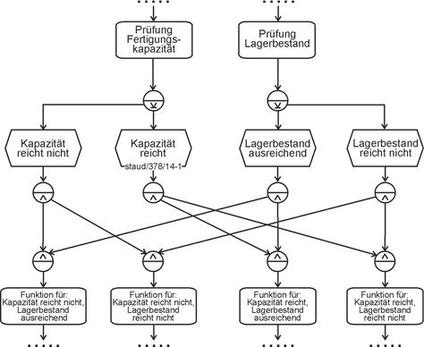 Danach folgen zwei Prüfungen: die der zur Verfügung stehenden Fertigungskapazitäten (durch die Abteilung Produktion) und die des Lagerbestandes (durch die Abteilung Lager). Dabei werden Daten der Produktionsplanung bzw. die Lagerdatenbank genutzt. Beide Prüfungen können zu einem positiven oder zu einem negativen Ergebnis führen. |