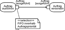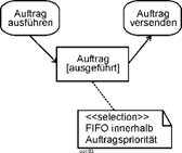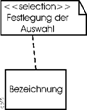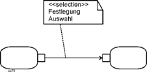 Es ist möglich, bei Objektknoten eine Auswahl festzulegen. Dies wird Auswahlverhalten (selection behavior) genannt. Es wird in einer Notiz (note symbol) angegeben, angeführt vom Schlüsselwort <<selection>> und an den Objektknoten angefügt, wie es die folgende Abildung zeigt. |