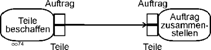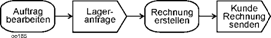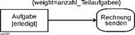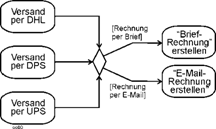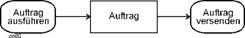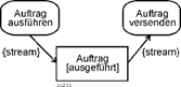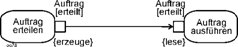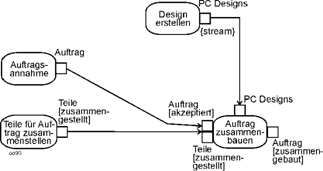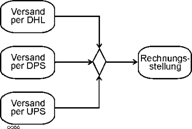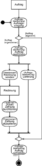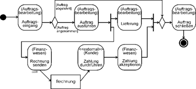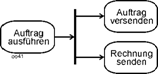 Auch das von anderen Methoden bekannte gleichzeitige Anstoßen mehrerer Aktionen ist im Beispiel erkennbar, vgl. Position (7). Nach der Ausführung des Auftrags erfolgt zum einen die Lieferung, zum anderen wird die Rechnung versandt. Ein solches Element wird später Gabelung (fork node) genannt. |