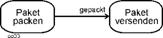 | Die im obigen Beispiel vorliegende Vereinigung entspricht dem UND-Operator, wie er in Ereignisgesteuerten Prozessketten verwendet wird. Das Beispiel oben macht aber folgendes deutlich: Im Vergleich mit EPKs ist eine Aktion hier gleich „Funktion + positivem (Ergebnis-)Ereignis“ dort. D.h., die UML-Autoren fassen das eigentliche „Geschehen“ in der Aktion mit dem positiven Ergebnis zusammen. Dies rührt daher, weil sie grundsätzlich weniger Verzweigungen realisieren und dann, wenn schon keine betrachtet werden, natürlich die positive Alternative genommen wird. Aktion=Funktion + positives Ergebnis Die Methode EPK dagegen trennt dies ganz grundsätzlich. Das „Geschehen“ in der Funktion ist getrennt von allen möglichen Ergebnissen. Diese werden durch die ja zwangsweise (von der Syntax erzwungenen) nachfolgenden Ereignisse modelliert. Funktion – Obige Vereinigung würde bei EPKs durch eine Folge von Funktionen und Ereignissen modelliert. Die folgenden Abbildungen zeigen in zwei Varianten das obige Beispiel in EPK-Notation.