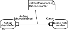 | Die strikte Trennung von Objekt- und Kontrollfluss, wie er für Aktivitätsdiagramme vorgesehen ist, kann in Ereignisgesteuerten Prozessketten nicht realisiert werden. Hier sind Objekte (im Sinne von Geschäftsobjekten) immer mit der Funktion (Tätigkeit) verbunden, bei der sie gelesen, erzeugt, verändert oder transportiert werden. Spezifizierung Objektfluss Eine Kantengewichtung bei Objektflüssen, vgl. Abbildung 10.7-13 mit {weight=all}, ist in EPKs durch Spezifizierung der Funktion möglich. Überhaupt erweisen sich die Beschriftungen der Funktionen, Ereignisse, Organisationseinheiten und Informationsobjekte als ein Werkzeug, mit dem viel von den Modellaussagen bei Aktivitätsdiagrammen in Ereignisgesteuerten Prozessketten ausgedrückt werden kann. Kanten- Ein Auswahlverhalten, vgl. das Beispiel in Abbildung 10.11-3, wäre ebenfalls durch eine Funktion möglich. Auswahl- Ein ständiger Fluss von Objekten mit {stream} ist in EPKs sinnvoll nicht zu realisieren. Das Grundkonzept ist hier die für die Prozessmodellierung übliche Vorstellung von sequentiell nacheinander ablaufenden elementaren Tätigkeiten. Ein streaming-Konzept sprengt den Rahmen dieses Grundkonzepts[5]. Dabei kann man sich Lösungen zu den Beispielen in den Abbildungen 10.4-20, 10.4-21 und 10.4-24 eher vorstellen als zum Beispiel in Abbildung 10.10-5, wo der streaming-Vorgang quasi parallel zum sonstigen Kontrollfuss angelegt ist. streaming Parameterknoten machen bei einer Übertragung keine Schwierigkeiten. Sie werden in einer EPK einfach als Informationsobjekte modelliert, die zu Beginn in den Prozess hineingegeben („Auftrag eingegangen“) oder am Ende als weiterzugebendes Ergebnis („Kalkulation weiterleiten“) herausgegeben werden. Parameter- Alle Elemente bei Aktivitätsdiagrammen die Richtung Gesamtsicht (vgl. oben und die Zusammenfassung unten) zeigen, sind in Ereignisgesteuerten Prozessketten nicht oder nur sehr schwer nachbildbar.