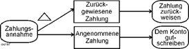 | Beim Einbau der Aktionen des Kunden in die Ereignisgesteuerte Prozesskette ist etwas Nachdenken nötig. Im Aktivitätsdiagramm ist die Handlung des Kunden (Zahlung durchführen) einfach in den Kontrollfluss, der ja ansonsten vom Unternehmen realisiert wird, eingebaut. Dies wird in der Prozessmodellierung typischerweise nicht so gemacht[6]. Dort wird zwischen dem Träger (oder den Trägern) des Prozesses und den Partnern des Prozesses entschieden. Dies ändert sich gerade, wenn zum Beispiel integrierte webbasierte Systeme für die Wertschöpfungsketten mehrerer zusammenarbeitender Unternehmen entwickelt werden, bzgl. der Kundenkontakte ist es aber meist so wie beschrieben: Die Handlungen des Kunden sind nicht Teil der Unternehmensprozsse. Externe Aktivitäten Die beiden in der Modellierung mit Ereignisgesteuerten Prozessketten typischen Vorgehensweisen sind in der EPK eingefügt. Entweder eine Wartefunktion (Warten auf Zahlungseingang) mit ihren Fortsetzungen (linke Seite, als Alternative gekennzeichnet) oder ein externes Ereignis (Zahlung eingegangen) mit seinen Fortsetzungen (rechte Seite) und der Einbindung durch den UND-Operator Vgl. zu beiden Konzepten Das Zusammenführen der Verzweigungen am Ende des Aktivitätsdiagramms kann wieder direkt in der EPK abgebildet werden. Verzweigungen zusammenführen