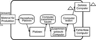 | Auch die von den UML-Autoren immer wieder thematisierte Nebenläufigkeit, das parallele unabhängig voneinander erfolgende Agieren einzelner Prozesse, ist dann nicht nur vorstellbar sondern notwendig. Nebenläufigkeit Ein weiterer Hinweis ergibt sich durch die Elemente restart und streaming, mit denen das Grundschema durchbrochen wird, dass eine Tätigkeit erst neu starten kann, wenn die vorige Aktivierung beendet ist. Ständiger Neustart Ersteres bedeutet, dass ein Prozess, der noch aktiv ist, gleich nochmals gestartet werden kann. In der Standardprozessmodellierung wird unausgesprochen davon ausgegangen, dass ein einmal gestarteter Prozess erst abgewickelt sein muß, bevor er neu gestartet werden kann. Dies ist auch durch die grafische Darstellung des Kontrollflusses, nicht anders möglich. Restart Auch das streaming-Konzept gehört hierher. Wie oben dargestellt, bedeutet streaming, dass eine bereits aktive Aktion weiterhin Input annehmen und Output abgeben kann. Sie bleibt also permanent aktiv. streaming Durch Systemorientierung zur Gesamtsicht