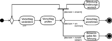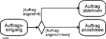 Die Strukturierung kennt, so deutet es das Beispiel an, Entscheidungsvorgänge, z.B. an Position (4). Diese werden später Verzweigung (decision node) genannt. Hier geht es darum, ob der Auftrag angenommen oder abgelehnt wird. Diese beiden Alternativen sind an den Kontrollflusskanten textlich vermerkt (vgl. die Positionen (5) und (6)). |