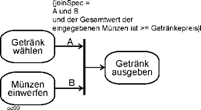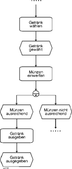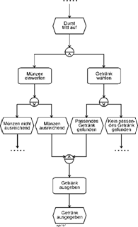 | Angedeutet sind aber auch die Möglichkeiten des Scheiterns: Münzen nicht ausreichend bzw. Kein passendes Getränk gefunden. Hier würden in einer ernsthaften Prozessbeschreibung die dadurch notwendigen Tätigkeiten folgen. Scheitern?