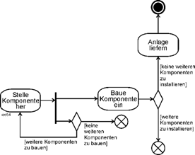 | Danach muß wieder für die Verzweigung im Aktivitätsdiagramm eine Entscheidungsfunktion (Prüfen, ob weitere Komponenten zu installieren sind) eingefügt werden mit den entsprechenden „Ergebnisereignissen“.