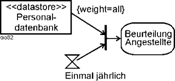 Datenspeicher wurden eingeführt, um ältere Formen des Datenflusses zu modellieren. Unter „älteren Formen“ verstehen die UML-Autoren, dass Daten persistent sind und bei Bedarf genutzt werden. Unter neueren Formen, dass die Daten flüchtig (transient) sind und genutzt werden, wenn sie verfügbar sind [OMG 2003a, S. 319]. |