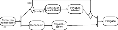 | Zumindest in den Beispielen entsteht der Eindruck, dass in den Aktivitätsdiagrammen sehr oft Aktion gleich „Funktion + positivem (Ergebnis-) Ereignis“ gesetzt wird. Es wird also vom positiven Ergebnis ausgegangen und nur dieses modelliert. Die Ausführungen zur Theorie geben hier direkt keine Antwort. Ist es Absicht oder Ausdruck einer von Systemen geprägten Modellierung? Aktion nur mit positivem Ende? Für eine Prozessmodellierung ist es aber keineswegs tauglich. Hier müssen oft verschiedene mögliche Ergebnisse einer Tätigkeit bedacht werden. Vgl. zu den möglichen Folgerungen hieraus Abschnitt 10.11.9 und die Gesamteinschätzung in Kapitel 14. Nicht in der Prozess- (6) Kontrollfluss