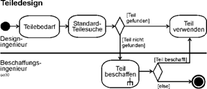| Verweise liegen in einfacher Form vor (vgl. Abschnitt 10.8 und das Beispiel Teiledesign und Teilebeschaffung in Abschnitt 10.11-4). Durch ein grafisches Symbol in einer Aktion wird dabei der Verweis deutlich gemacht. Die Bezeichnung der Aktion ist auch die Bezeichnung der eingebetteten Aktivität. Von einem Aktivitätsdiagramm zum nächsten (9) Berücksichtigung der zeitlichen Dimension