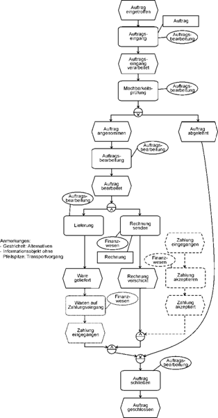 | Insgesamt macht dieses Beispiel deutlich, dass das ausdrückliche Anfordern von Ereignissen in Ereignisgesteuerten Prozessketten eine segensreiche Wirkung hat: Die Aussagekraft wird erhöht und außerdem wird das Erkennen von Verzweigungen eher angestoßen. Erzwungene Ereignisse