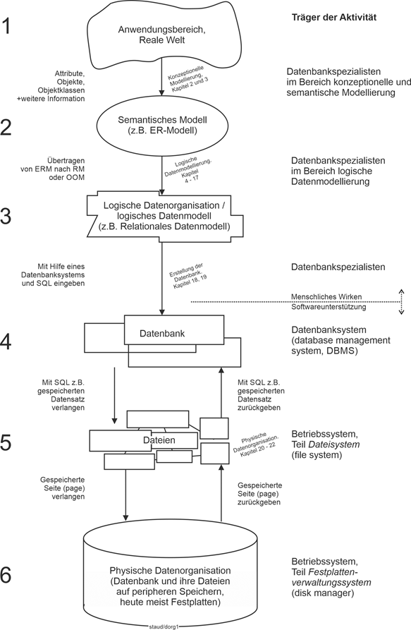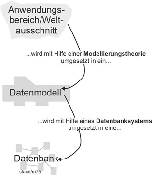 - Die Betrachtung des gesamten Wegs von der Wahrnehmung des Anwendungsbereichs bis zur Erstellung der Datenbank und der physischen Datenorganisation.