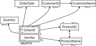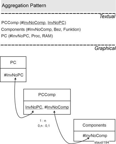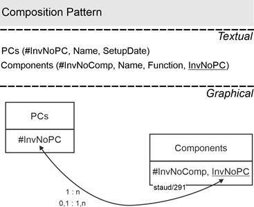 - Designations of attributes are slightly smaller, bold, and set in Arial: Salary, Name, Date. In compound designations, the subsequent term is capitalized again: PersNr (personnel number), BezProj (project designation).