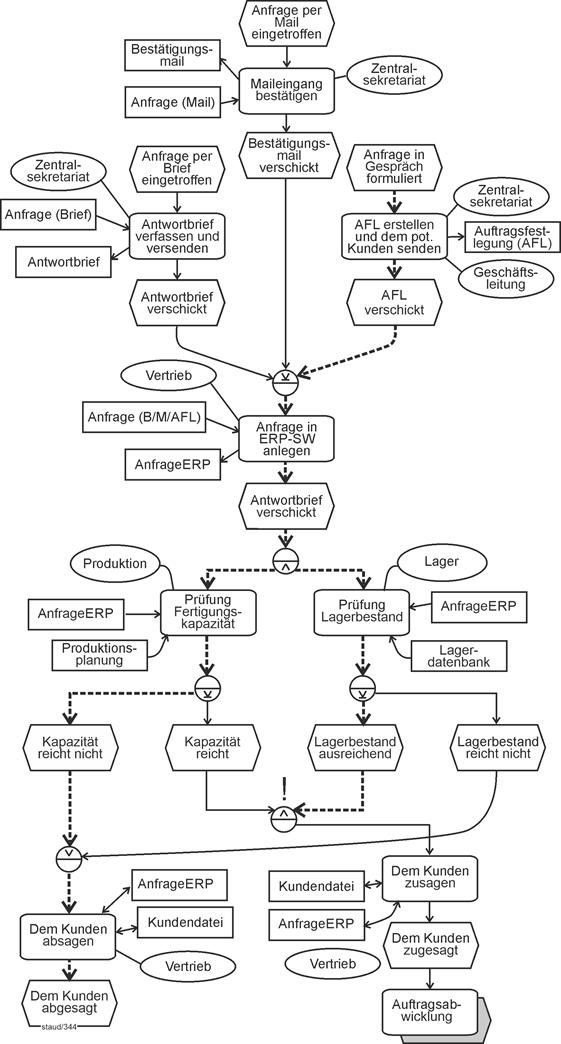 - Fragen der Semantik und ihrer Umsetzung in syntaktisch korrekte EPK-Fragmente ("Semantik sucht Syntax") stehen im Mittelpunkt von Kapitel 6. Dazu werden die wichtigsten semantischen Muster, die in Geschäftsprozessen vorkommen, und ihre Umsetzung in Ereignisgesteuerte Prozessketten gezeigt.