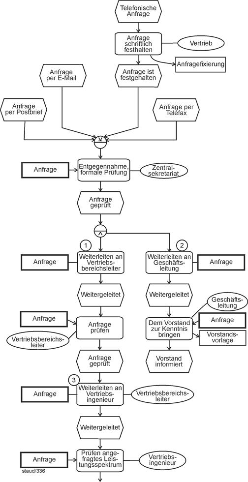 "Unter Ablauforganisation versteht man die Gestaltung von Arbeitsprozessen. ... Man unterscheidet (1) die Ordnung des Arbeitsinhalts, (2) die Ordnung der Arbeitszeit, (3) die Ordnung des Arbeitsraumes, (4) die Arbeitszuordnung" [Wöhe 1993, S. 196]. |