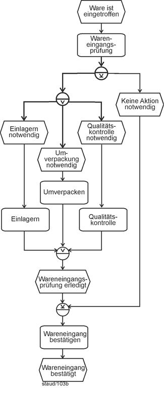 - Die Einführung in den Aufbau von Ereignisgesteuerten Prozessketten wird in Kapitel 5 fortgesetzt mit der Darstellung syntaktischer Basismuster. Vorgestellt werden alle möglichen Verknüpfungen von Ereignissen und Funktionen im Kontrollfluss. Hier steht noch die Syntax im Vordergrund, es wird aber auch bereits auf die Semantik der Fragmente hingewiesen.